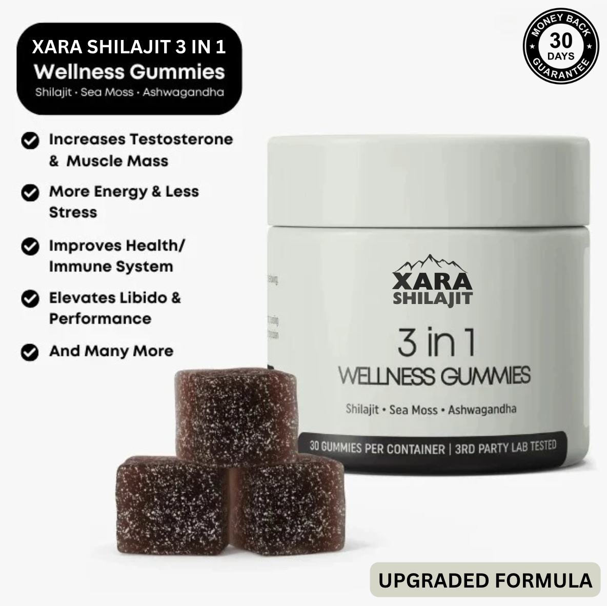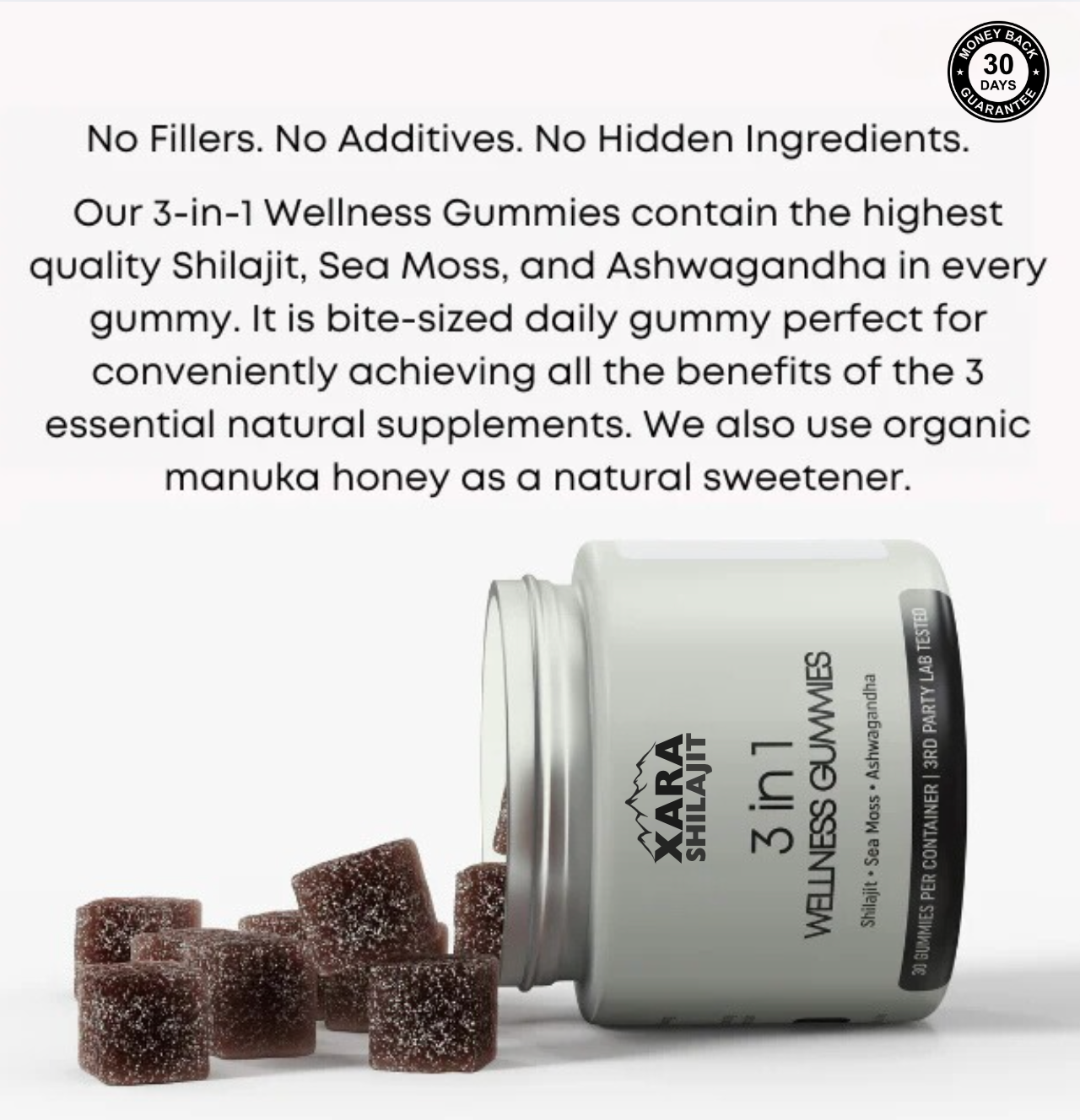If you use XARA® 3 in 1 wellness gummies for 30 days and you don't notice improvements in overall health, an increase in your sexual health, energy, and more send an email to support@xarashilajit.com and we'll give you a full refund.